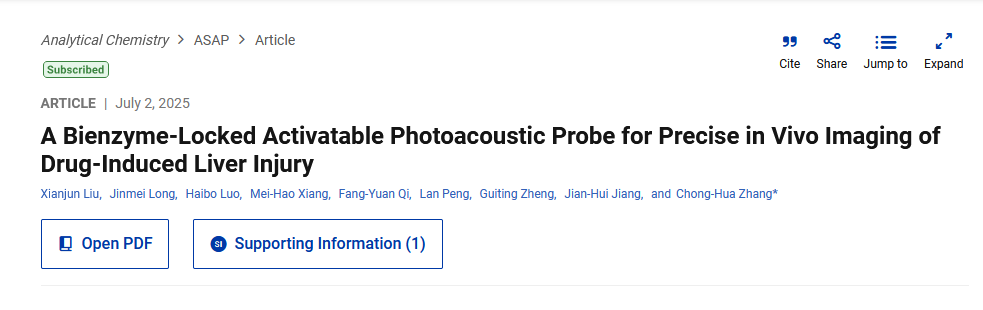 近日,公司教师刘贤军副研究员,张崇华副教授开发了一种新型双酶型可激活式光声探针用于药物性肝损伤的精准活体成像。该研究成果以“A Bienzyme-Locked Activatable Photoacoustic Probe for Precise In Vivo Imaging of Drug-Induced Liver Injury”为题发表在国际顶级期刊《Analytical Chemistry》上,该期刊为分析化学领域的经典Top期刊。该研究工作主要由刘贤军博士(第一作者)和张崇华副教授(通讯作者)共同完成,永利yl23411为第一单位。